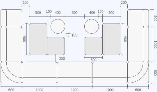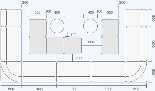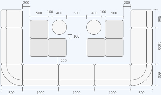 ソファ席での、正方形と長方形テーブルの組み合わせをグループごとの着席パターン想定し、ブース構成や人数のまとまりがひと目でわかる図でレイアウトしました。テーブルのサイズと卓数の目安や、席間の余裕、出入り、配膳の動線などもご確認いただけます。