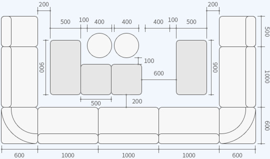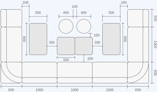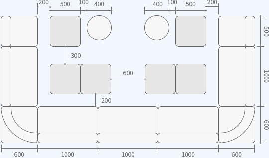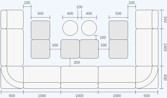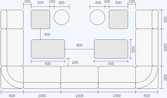 スナックやキャバクラなどで利用するテーブルの標準高は、膝がテーブルの下に入ることを想定した、600mm程度を目安にします。組み合わせるソファの座面高は、通常380mm前後です。
